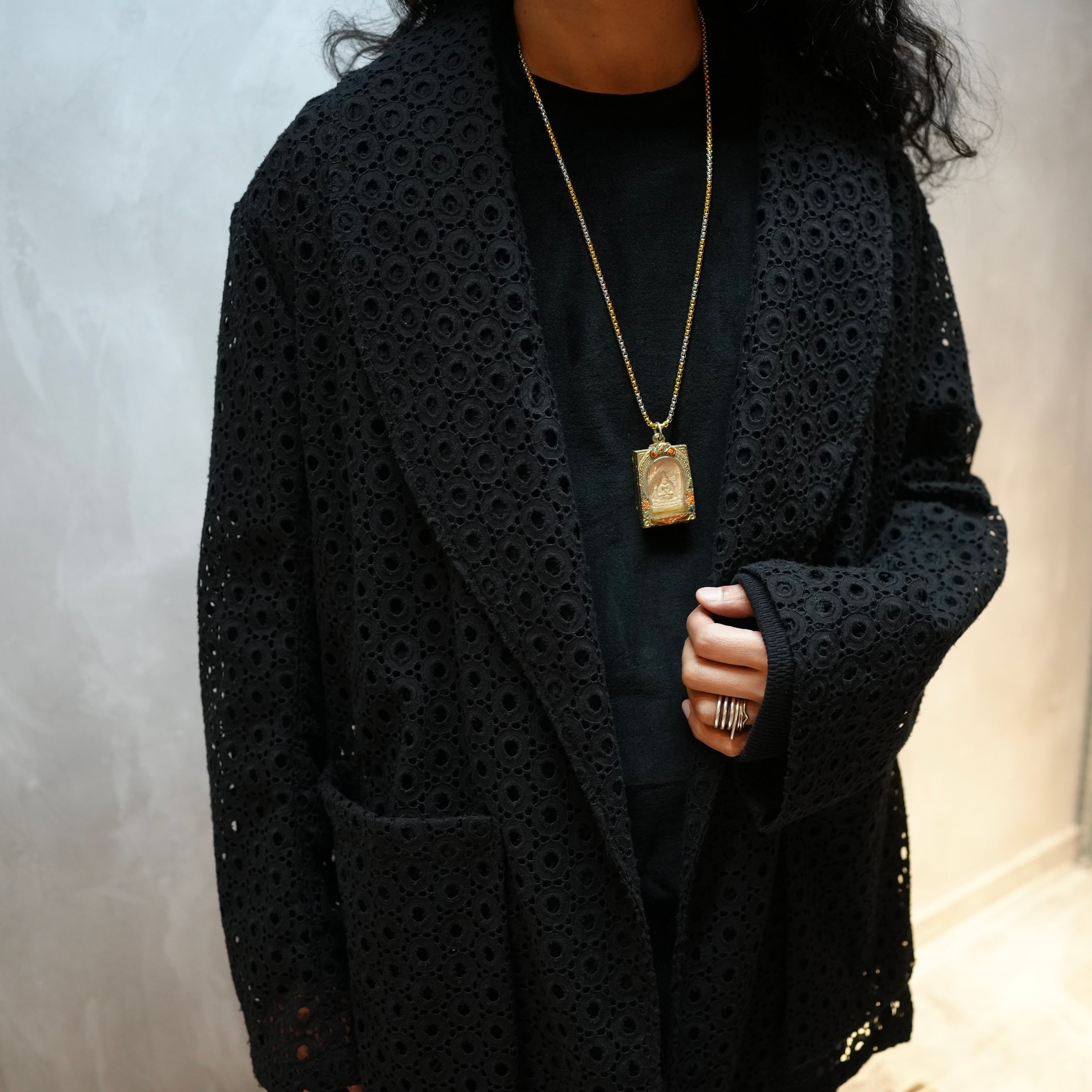 数年前にバンコクで、首にじゃらじゃらと飾りをつけているおじさまとすれ違った。わたしが作っているvintage charm chokerに通ずるものを感じて胸が高鳴った。後にそれが御守りだということを知って、更にその細工にも魅せられ とても欲しくなった。寺院でひとつひとつ僧侶の祈祷が込められているそう。その時運良く幾つか入手することができてpendantにしたのがはじまりだった。(その第一群はきちんとご紹介する間もなくpopupで旅立ちました)
