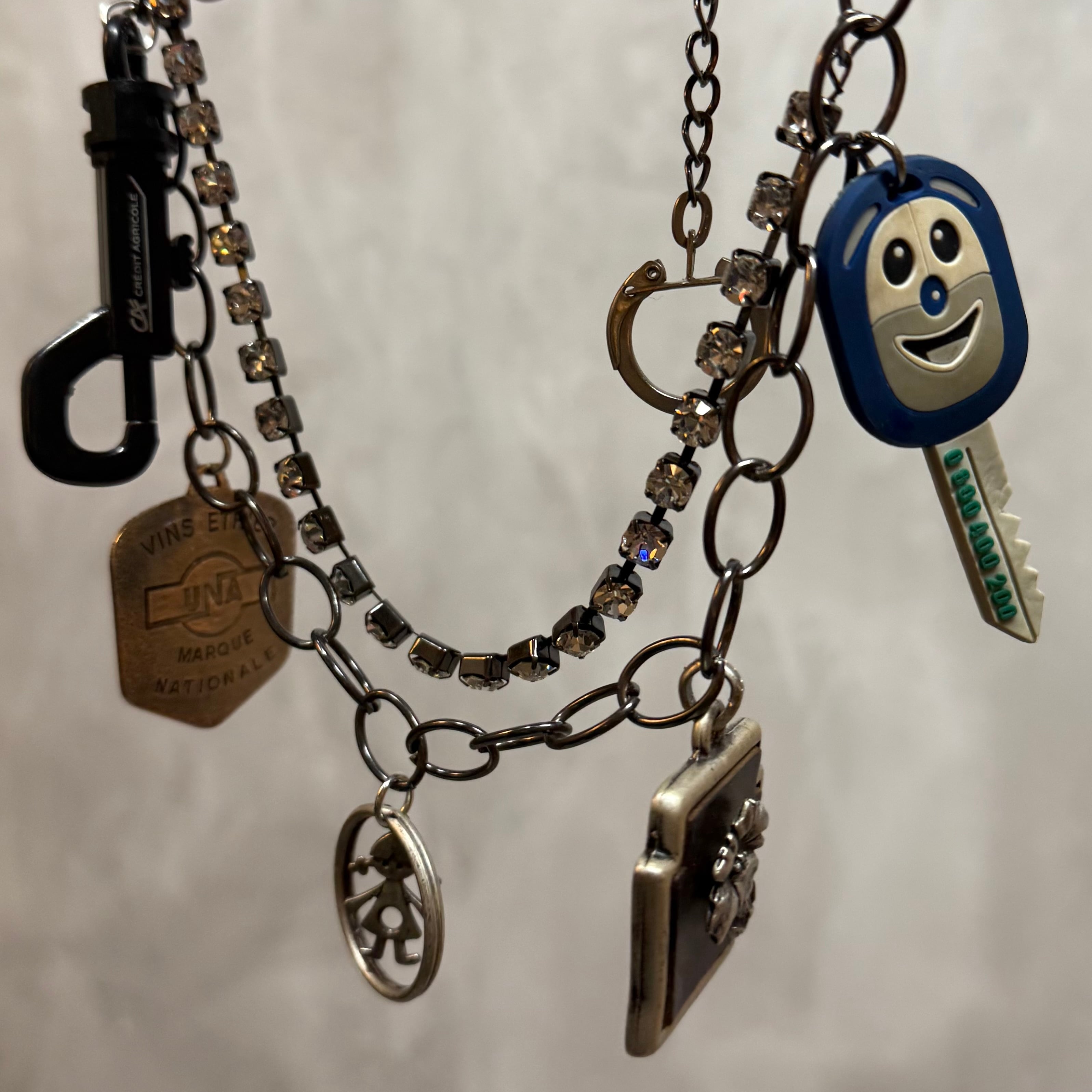フランスのキーホルダーや、アメリカのペンダントトップ、骨董市のおもちゃなど、世界各国のビンテージチャームをぶら下げたチョーカー。